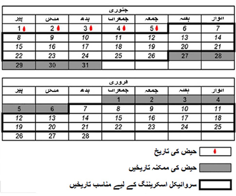 دوران سروائیکل اسکریننگ سے گریز کرنا چاہیے۔ لہذا، براہ کرم ماہواری سے پہلے یا بعد میں اپنی